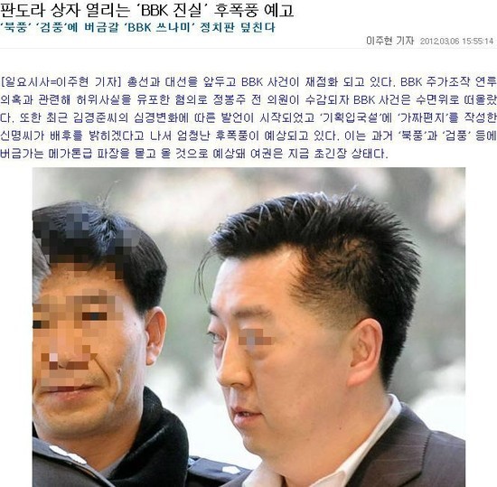 △사진 : @일요시사 홈피 기사 캡쳐 / 판도라 상자 열리는 'BBK 진실' 핵폭탄 예고[전문링크]